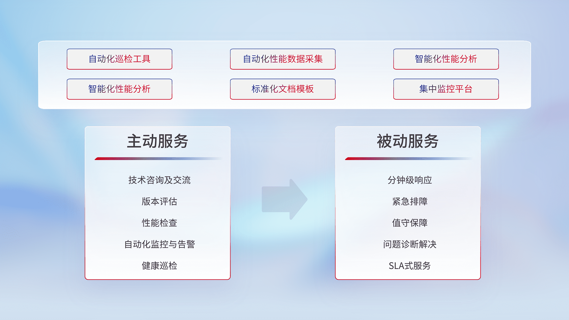 智能化工具和标准化文档,,,,保障服务质量,,提供主动服务(包含技术咨询、、版本评估、、、、性能检查、、、自动化监控与告警、、、、健康巡检)和被动服务包含(分钟级响应、、紧急排障、、、、值守保障、、、问题诊断解决、、、、SLA服务)。。